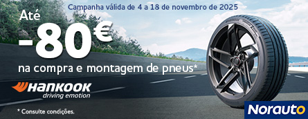Na Norauto, aproveite até 18 de novembro de 2025 um desconto de até 80€ na compra e montagem de pneus Hankook. Garanta aderência, conforto e segurança em cada viagem!